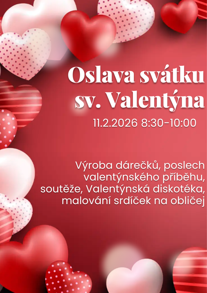Milí rodiče, zítra nás čeká oslava svátku svatého Valentýna - od 8.30 - 10.00, výroba dárečků, poslech valentýnského příběhu, soutěže, Valentýnská diskotéka, malování srdíček na obličej.