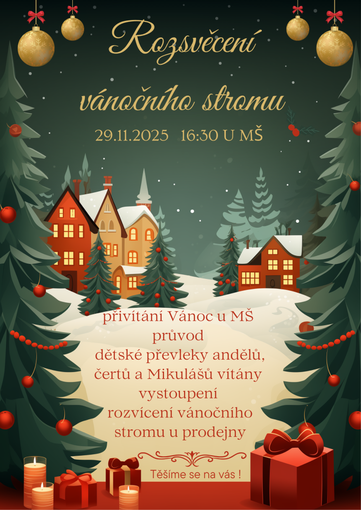 Srdečně Vás zveme rozsvěcení vánočního stromu, která každoročně přináší krásnou vánoční atmosféru. Letos proběhne 29.11.2025 od 16:30. Setkáme se u MŠ a budeme pokračovat k prodejně. Dětské převleky andělů, Mikulášů a čertíků jsou vítány. Těšíme se na Vás!