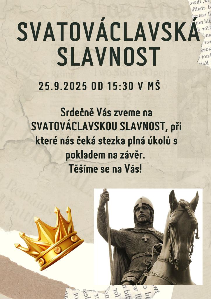 Milí rodiče, ve čtvrtek nás od 15:30 čeká svatováclavská slavnost. Akce se z důvodu počasí bude konat uvnitř sokolovny. Pro vás a vaše děti bude připraveno krátké divadýlko o svatém Václavovi a plnění 5 tematických úkolů, za které si pak budou moci vybrat odměnu.