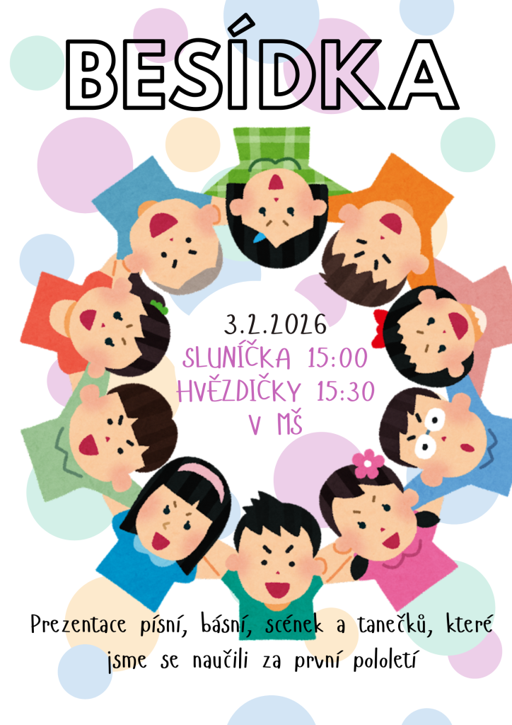 Besídka pro rodiče, prarodiče a přátelé naší školky od 15.00 ve třídě SLUNÍČEK, ve HVĚZDIČKÁCH pak od 15:30. Můžete se těšit na prezentace písní, básní, scének a tanečků, které jsme se naučili za první pololetí. Těšíme se na vás.